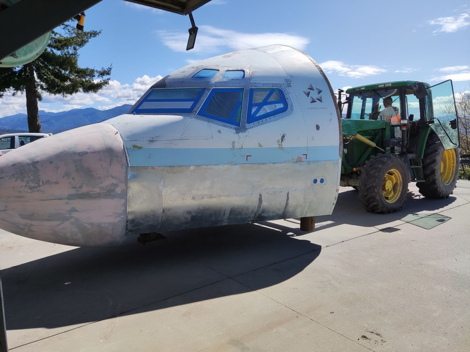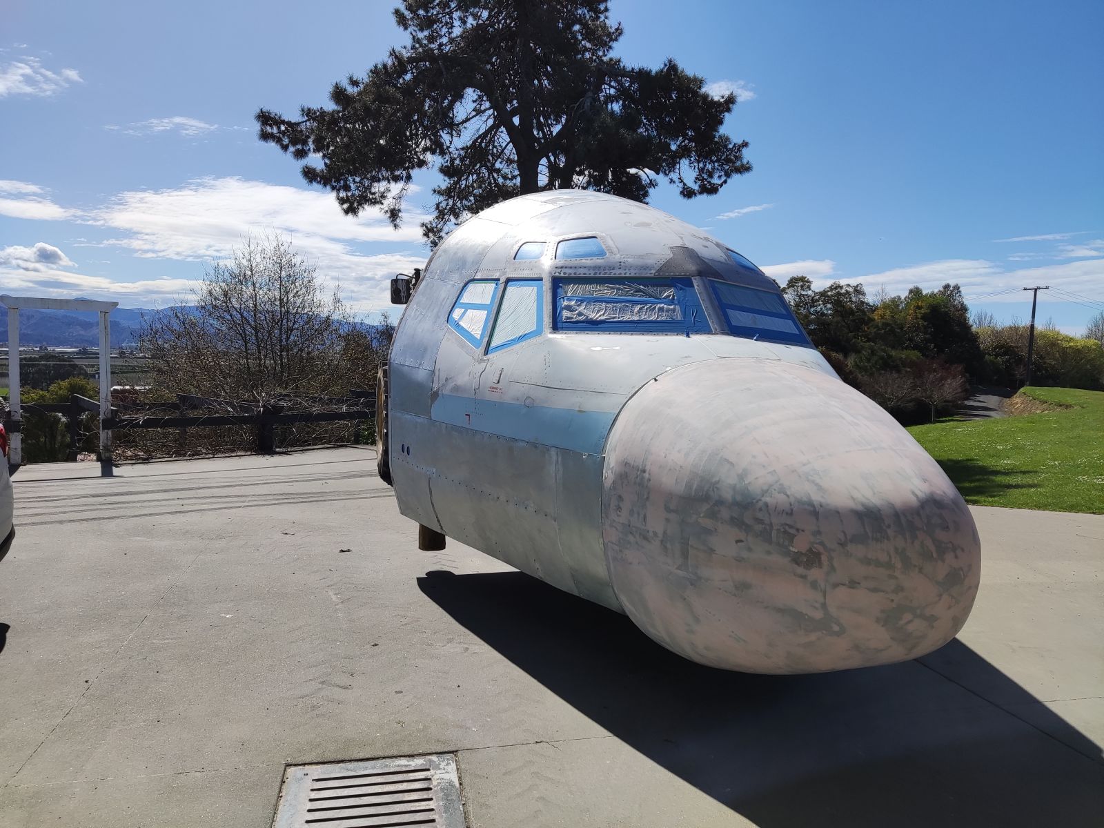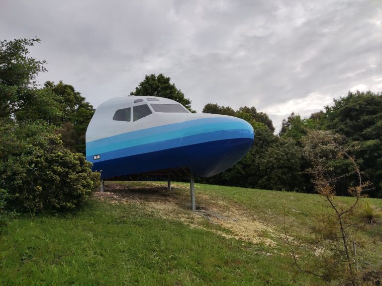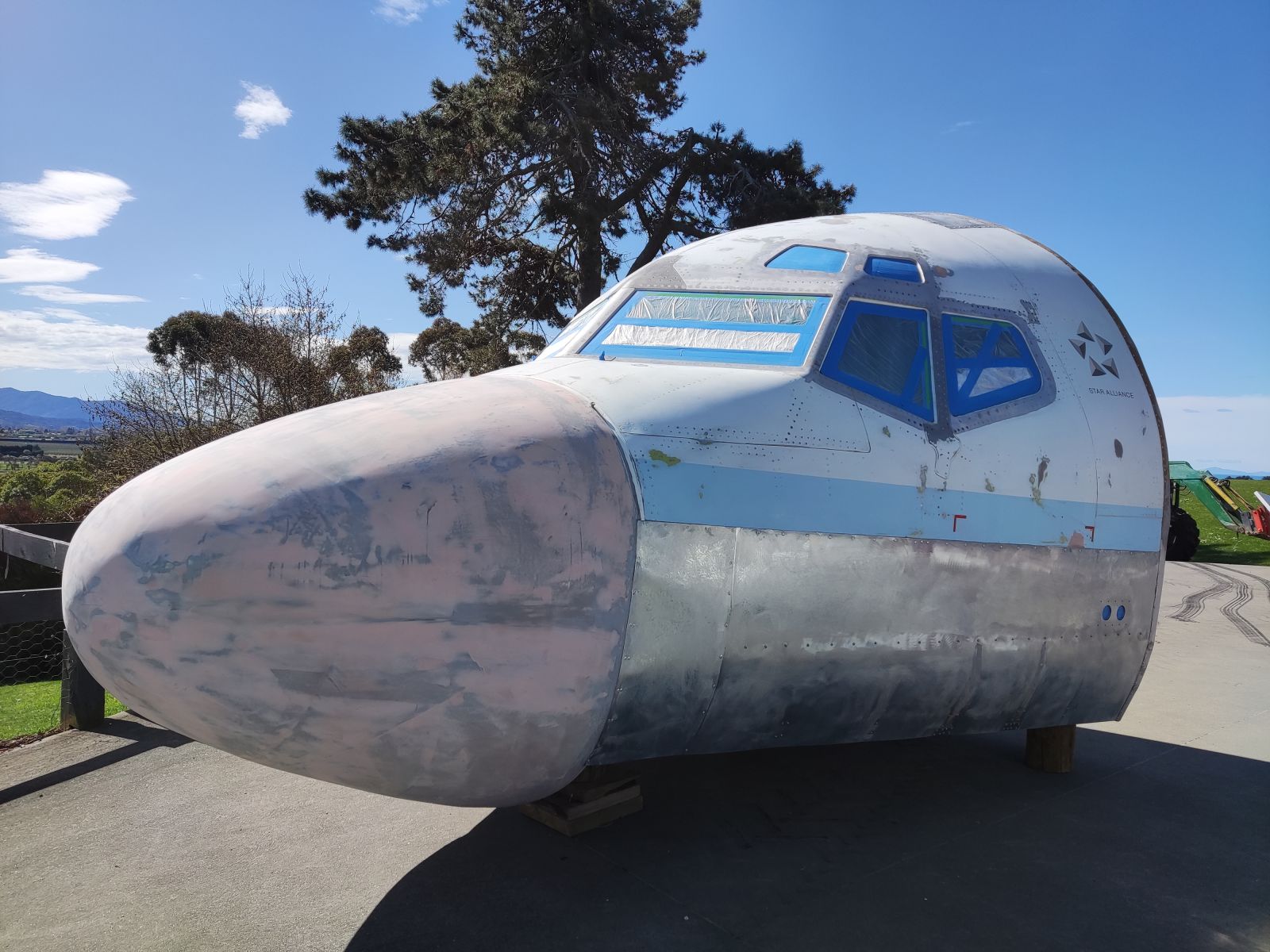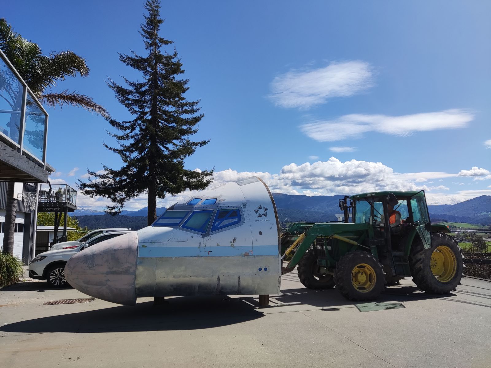 Unser Vermieter hat das Cockpit ohne Nase einer ausrangierten Boeing 737-300 irgendwo aufgetrieben. Der Transport allein auf dem Anhänger zu sich nach Hause muss wohl schon interessant gewesen sein, da ein Flugzeug auf der Strasse nichts alltägliches ist. Angefangen hat Ross dann mit dem Entfernen aller Leitungen. Dann musste der Rahmen hinten nachgebildet werden. Das erfolgte mit kurzen Metallstücken die er zusammengeschweisst hatte, damit es wieder stabilisierend den Bogen ergibt. Für die Nase wurden Styroporplatten zusammengeklebt und dann mit einem Gitter als Muster zu der Form abgeschliffen. Das muss wohl eine Riesensauerei gewesen sein. Ab diesem Zeitpunkt sind wir dann aus Deutschland angekommen. Die Nase wurde dann mit Glasfasermatten verstärkt, grundiert und an den vorderen Teil des Cockpits befestigt. Im nächsten Schritt wurden Muster für die Fenster aus Karton ausgeschnitten und das Plexiglas entsprechend zugeschnitten. Die Fenster wurden eingeklebt und mit Silikon abgedichtet. Mussten teilweise noch erwärmt werden, da sie nicht plan eingebaut werden konnten. Die seitlichen unteren Bleche wurden zugeschnitten und alles vernietet. Die Wand hinten wurde aus Holzplatten gemacht, aus 2 Teilen bei denen der Türausschnitt schon eingerechnet ist. Abdichtung hinten dann mit Abkantblechen und verklebt. Dann die Tür eingebaut. Um Frischluft reinzubekommen wurden kleine Gitter seitlich eingebaut. Dann noch weiche Schaumstoffmatten eingelegt, bevor dann der Teppich drüber gekommen ist. Nachdem dann das komplette Flugzeug abgeschliffen wurde kam die große Herausforderung es irgendwie aus der Garage zu befördern um es dann zu grundieren und lackieren. Mit verlängerten Gabeln und Ross‘ Traktor konnte das Cockpit angehoben werden und ganz langsam rückwärts aus der Garage gefahren werden. Nun konnte das Cockpit lackiert werden in den Originalfarben. Das ganze Cockpit wieder zurück in die Garage und auf die 3 provisorisch verschraubten Pfosten gesetzt. Cockpit war nun fertig und bereit für seinen ersten und letzten Flug zu seinem Zielflughafen: auf die Wiese am See mit direktem Blick darauf. Die Frage stellte sich wie wir es schaffen die 3 Metallpfosten genau an die Stelle unten an dem Hang einzubetonieren wo letztendlich sein sollte. Ross hatte ein Dreieck zusammengeschweißt aus Metallschienen und an jeder Ecke ein Loch gebohrt. Zur weiteren Vorbereitung wurden Metallplatten auf die Metallpfosten geschweißt mit jeweils 3 Bolzen auf der Mitte. Zinkspray gegen Rost um nun mit dem Muster genau die Stelle zu markieren für die Löcher am Boden wo das Cockpit genau sein sollte. An der Stelle war ein Busch. Den haben wir dann mit dem Traktor und einer Kette einfach rausgerissen aus dem Boden. Wir haben das Metallmuster auf der hinteren Seite aufgelegt und die vordere Seite soweit angehoben dass sie im Wasser lag. Die Spitze vorne nach unten gelotet und mit Markierungsspray den Lochmittelpunkt am Boden markiert. Abends kam dann noch Ross‘ Nachbar Mark mit seinem kleinen Bagger und dem Schneckenbohrer worauf wir die 3 Löcher in den Boden graben konnten. Die hinteren 2 Löcher waren nur ein Meter tief das vordere Loch ein 1,70m. Dann noch den Dreck weggeschaufelt und weiter ging es am nächsten Tag mit dem Positionieren und Befestigen der 3 Pfosten als Vorbereitung für das Einbetonieren. Wir hatten dazu Kieselsteine geholt um ein wenig die Pfosten wieder höher zu setzen und einen besseren Untergrund zu bekommen. Dann die 3 Pfosten eingesetzt mit Klammern an Holz Verstrebungen befestigt und entsprechend austariert und ins Wasser gesetzt. Dann ging es weiter die Löcher mit Beton zu füllen. Wir haben zirka 40 Schubkarren Beton mit einem kleinen Mischer benötigt um die 3 Löcher zu füllen. Am nächsten Tag, also 24 Stunden später, ging es dann los das Cockpit auf seine Reise zu schicken zu seinem finalen Standort Wir hatten uns den Abend zuvor sämtliche Gedanken gemacht wie dies am besten erfolgen könnte da das Gelände doch sehr abschüssig und steil ist und die langen Gabeln vom Traktor sich leicht nach links und rechts verschieben lassen. Wir haben dazu unter dem Cockpit, nachdem wir die Gabeln langsam eingefahren hatten, links und rechts von der Gabel lange Holzlatten angeschraubt wie eine Spur beim Ski Weitsprung. Dann ging es los rückwärts aus der Garage, um das Wohnhaus herum, mit 0,8 km/h ganz langsam den Hang hinunter. Per Headset konnten Ross und ich kommunizieren um entsprechend die Gabel nach oben oder in einen anderen Winkel zu bekommen als Ausgleich für den Hang. Wir kamen dem Ziel immer näher, unser Herz raste, und als wir final vor den Pfosten standen ging es nun darum die 3 Metallplatten der Pfosten genau zu treffen. Dies hat ein Weilchen gedauert, weil es mit dem Traktor nur vorwärts und rückwärts ging und man die Gabeln nicht links und rechts verschieben konnte. Zumal war das Gelände dort auch abschüssig wir haben es dann geschafft die 3 Pfosten zu treffen. Yeeees – geschafft! Mit einem Spanngurt konnten wir die vordere Auflagefläche des Cockpits noch besser mittig auf den Pfosten platzieren, final noch mit Schrauben und Muttern befestigt – fertig. Das Cockpit stand an seiner Stelle wir waren happy und haben unsere großen Tag mit einem tollen Barbecue und Bier beendet.