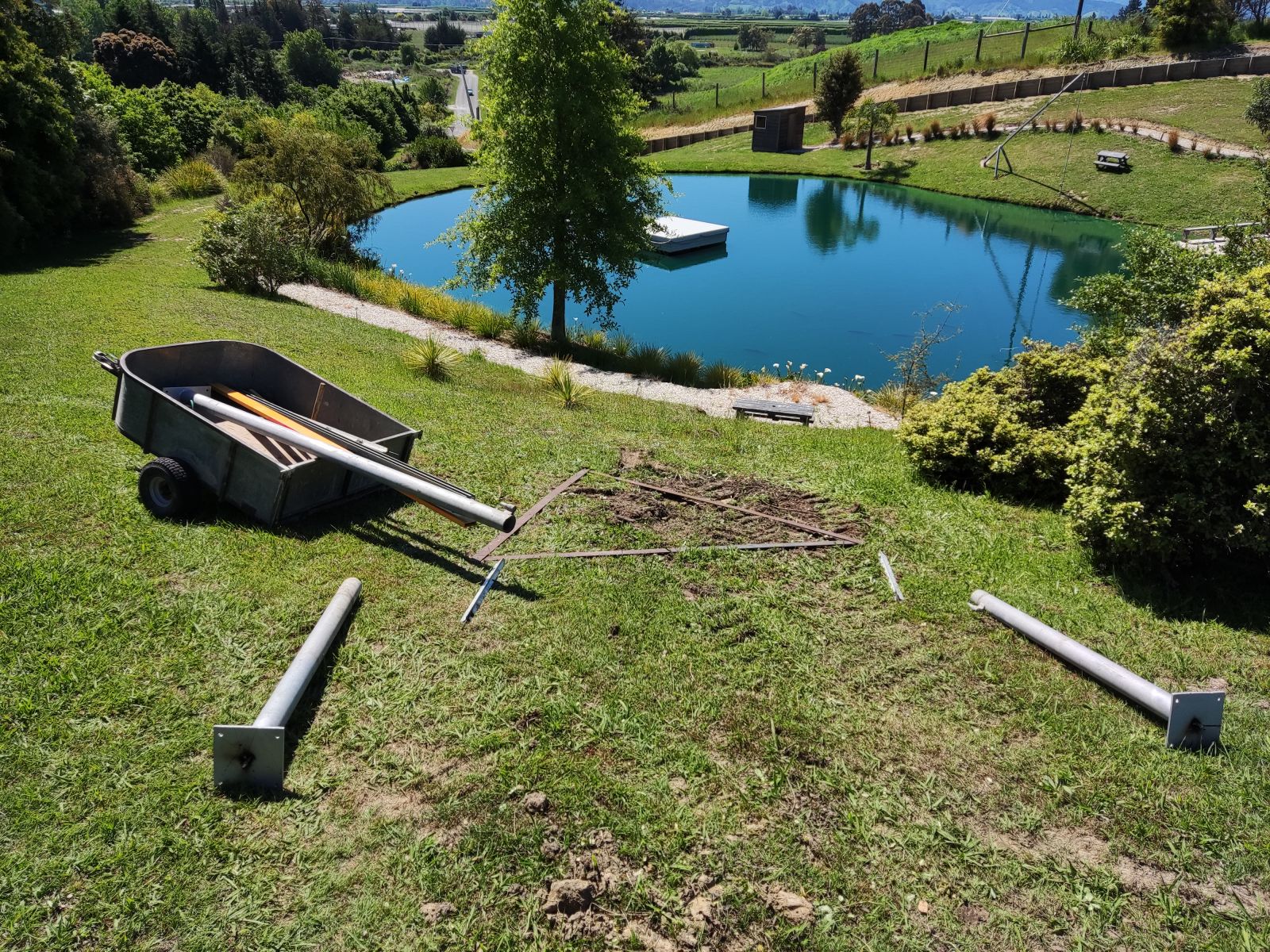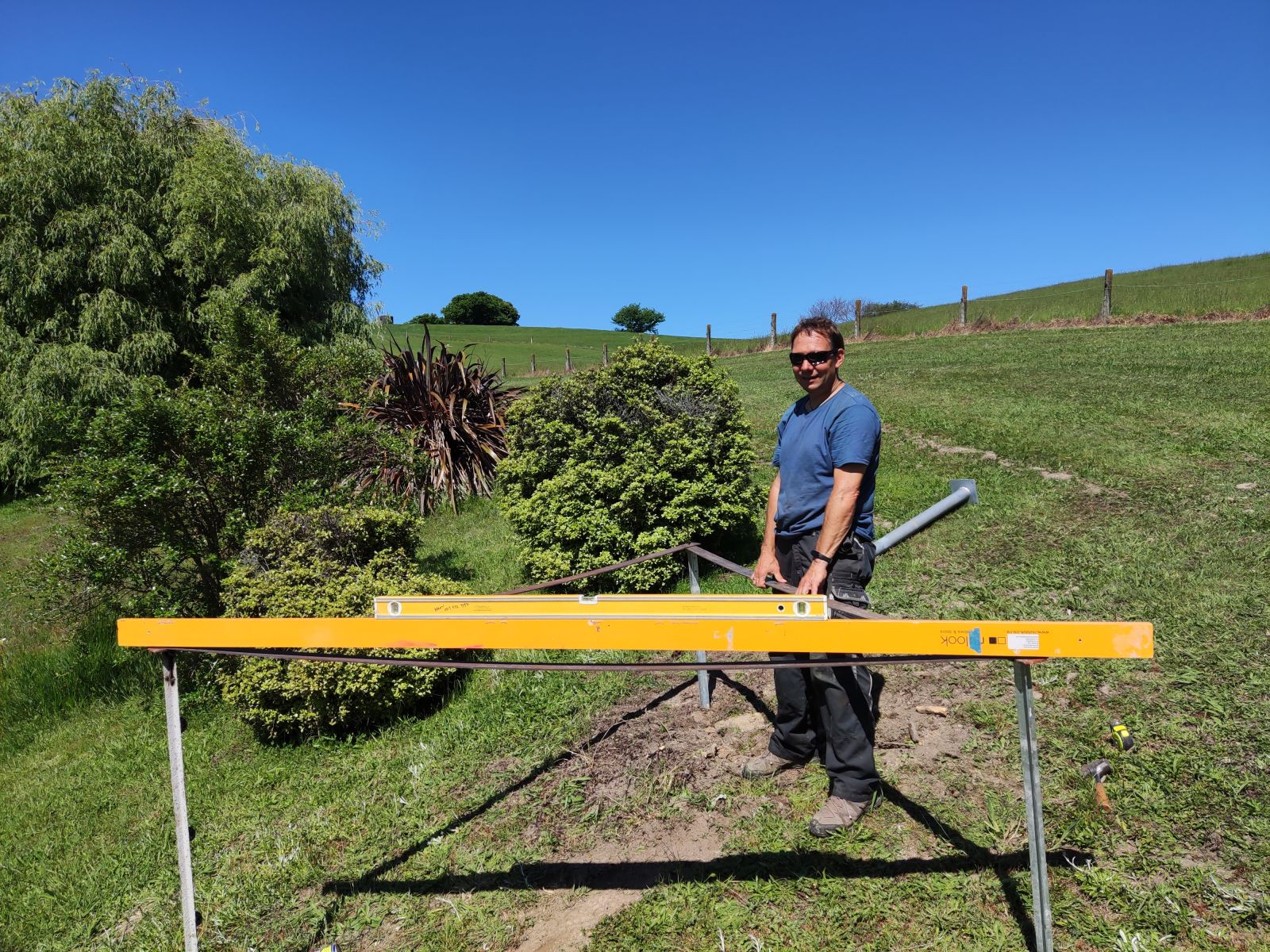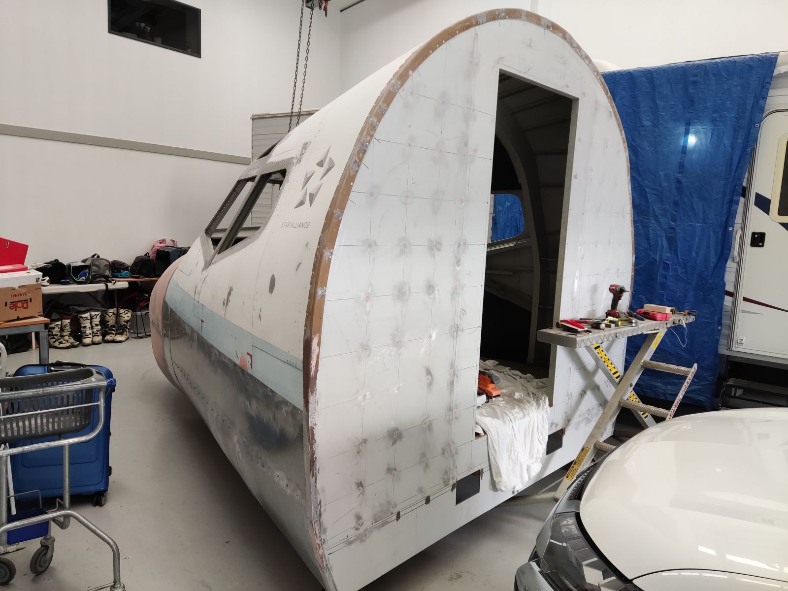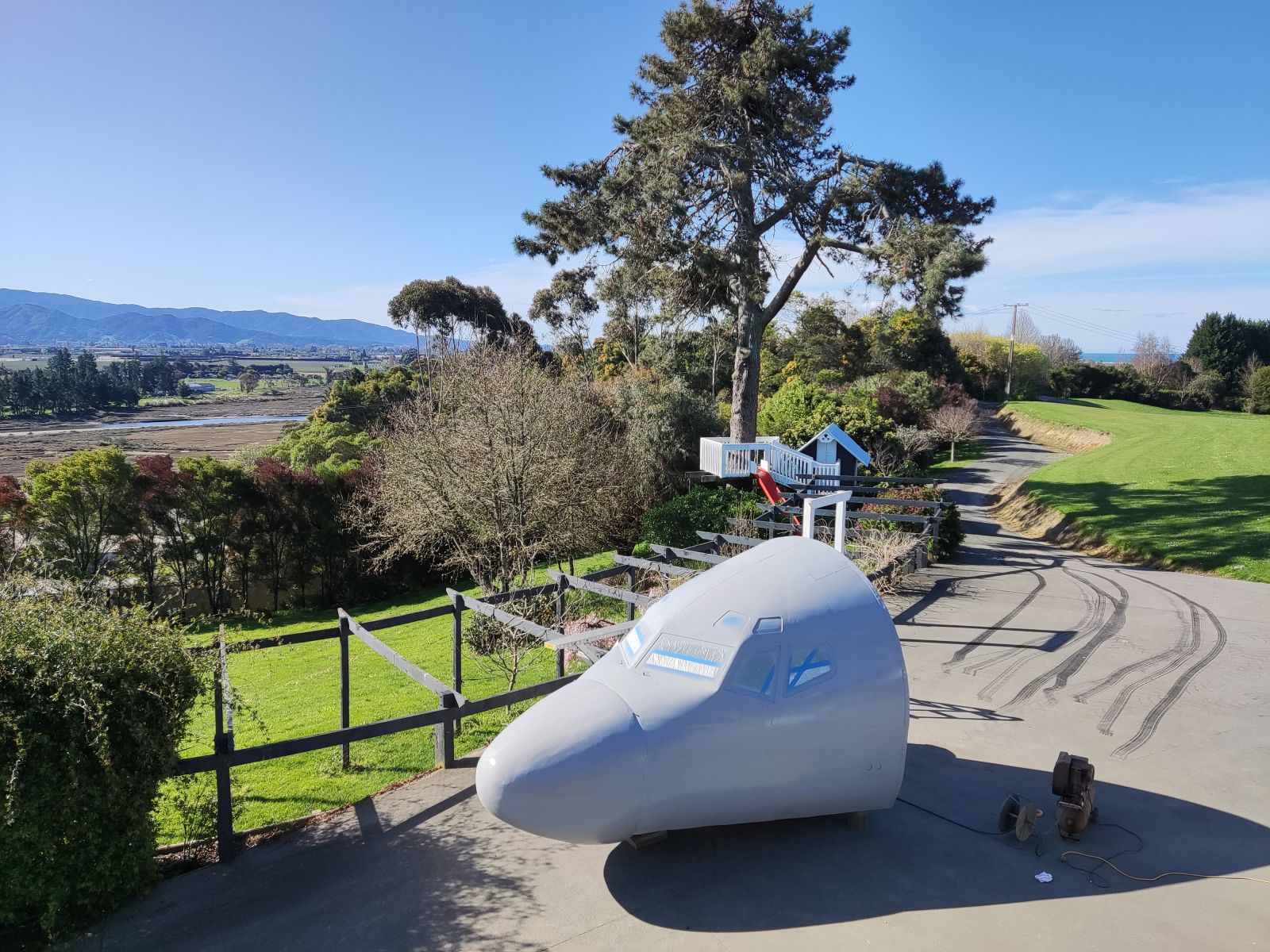 Unser Vermieter hat das Cockpit ohne Nase einer ausrangierten Boeing 737-300 irgendwo aufgetrieben. Der Transport allein auf dem Anhänger zu sich nach Hause muss wohl schon interessant gewesen sein, da ein Flugzeug auf der Strasse nichts alltägliches ist. Angefangen hat Ross dann mit dem Entfernen aller Leitungen. Dann musste der Rahmen hinten nachgebildet werden. Das erfolgte mit kurzen Metallstücken die er zusammengeschweisst hatte, damit es wieder stabilisierend den Bogen ergibt. Für die Nase wurden Styroporplatten zusammengeklebt und dann mit einem Gitter als Muster zu der Form abgeschliffen. Das muss wohl eine Riesensauerei gewesen sein. Ab diesem Zeitpunkt sind wir dann aus Deutschland angekommen. Die Nase wurde dann mit Glasfasermatten verstärkt, grundiert und an den vorderen Teil des Cockpits befestigt. Im nächsten Schritt wurden Muster für die Fenster aus Karton ausgeschnitten und das Plexiglas entsprechend zugeschnitten. Die Fenster wurden eingeklebt und mit Silikon abgedichtet. Mussten teilweise noch erwärmt werden, da sie nicht plan eingebaut werden konnten. Die seitlichen unteren Bleche wurden zugeschnitten und alles vernietet. Die Wand hinten wurde aus Holzplatten gemacht, aus 2 Teilen bei denen der Türausschnitt schon eingerechnet ist. Abdichtung hinten dann mit Abkantblechen und verklebt. Dann die Tür eingebaut. Um Frischluft reinzubekommen wurden kleine Gitter seitlich eingebaut. Dann noch weiche Schaumstoffmatten eingelegt, bevor dann der Teppich drüber gekommen ist. Nachdem dann das komplette Flugzeug abgeschliffen wurde kam die große Herausforderung es irgendwie aus der Garage zu befördern um es dann zu grundieren und lackieren. Mit verlängerten Gabeln und Ross‘ Traktor konnte das Cockpit angehoben werden und ganz langsam rückwärts aus der Garage gefahren werden. Nun konnte das Cockpit lackiert werden in den Originalfarben. Das ganze Cockpit wieder zurück in die Garage und auf die 3 provisorisch verschraubten Pfosten gesetzt. Cockpit war nun fertig und bereit für seinen ersten und letzten Flug zu seinem Zielflughafen: auf die Wiese am See mit direktem Blick darauf. Die Frage stellte sich wie wir es schaffen die 3 Metallpfosten genau an die Stelle unten an dem Hang einzubetonieren wo letztendlich sein sollte. Ross hatte ein Dreieck zusammengeschweißt aus Metallschienen und an jeder Ecke ein Loch gebohrt. Zur weiteren Vorbereitung wurden Metallplatten auf die Metallpfosten geschweißt mit jeweils 3 Bolzen auf der Mitte. Zinkspray gegen Rost um nun mit dem Muster genau die Stelle zu markieren für die Löcher am Boden wo das Cockpit genau sein sollte. An der Stelle war ein Busch. Den haben wir dann mit dem Traktor und einer Kette einfach rausgerissen aus dem Boden. Wir haben das Metallmuster auf der hinteren Seite aufgelegt und die vordere Seite soweit angehoben dass sie im Wasser lag. Die Spitze vorne nach unten gelotet und mit Markierungsspray den Lochmittelpunkt am Boden markiert. Abends kam dann noch Ross‘ Nachbar Mark mit seinem kleinen Bagger und dem Schneckenbohrer worauf wir die 3 Löcher in den Boden graben konnten. Die hinteren 2 Löcher waren nur ein Meter tief das vordere Loch ein 1,70m. Dann noch den Dreck weggeschaufelt und weiter ging es am nächsten Tag mit dem Positionieren und Befestigen der 3 Pfosten als Vorbereitung für das Einbetonieren. Wir hatten dazu Kieselsteine geholt um ein wenig die Pfosten wieder höher zu setzen und einen besseren Untergrund zu bekommen. Dann die 3 Pfosten eingesetzt mit Klammern an Holz Verstrebungen befestigt und entsprechend austariert und ins Wasser gesetzt. Dann ging es weiter die Löcher mit Beton zu füllen. Wir haben zirka 40 Schubkarren Beton mit einem kleinen Mischer benötigt um die 3 Löcher zu füllen. Am nächsten Tag, also 24 Stunden später, ging es dann los das Cockpit auf seine Reise zu schicken zu seinem finalen Standort Wir hatten uns den Abend zuvor sämtliche Gedanken gemacht wie dies am besten erfolgen könnte da das Gelände doch sehr abschüssig und steil ist und die langen Gabeln vom Traktor sich leicht nach links und rechts verschieben lassen. Wir haben dazu unter dem Cockpit, nachdem wir die Gabeln langsam eingefahren hatten, links und rechts von der Gabel lange Holzlatten angeschraubt wie eine Spur beim Ski Weitsprung. Dann ging es los rückwärts aus der Garage, um das Wohnhaus herum, mit 0,8 km/h ganz langsam den Hang hinunter. Per Headset konnten Ross und ich kommunizieren um entsprechend die Gabel nach oben oder in einen anderen Winkel zu bekommen als Ausgleich für den Hang. Wir kamen dem Ziel immer näher, unser Herz raste, und als wir final vor den Pfosten standen ging es nun darum die 3 Metallplatten der Pfosten genau zu treffen. Dies hat ein Weilchen gedauert, weil es mit dem Traktor nur vorwärts und rückwärts ging und man die Gabeln nicht links und rechts verschieben konnte. Zumal war das Gelände dort auch abschüssig wir haben es dann geschafft die 3 Pfosten zu treffen. Yeeees – geschafft! Mit einem Spanngurt konnten wir die vordere Auflagefläche des Cockpits noch besser mittig auf den Pfosten platzieren, final noch mit Schrauben und Muttern befestigt – fertig. Das Cockpit stand an seiner Stelle wir waren happy und haben unsere großen Tag mit einem tollen Barbecue und Bier beendet.
