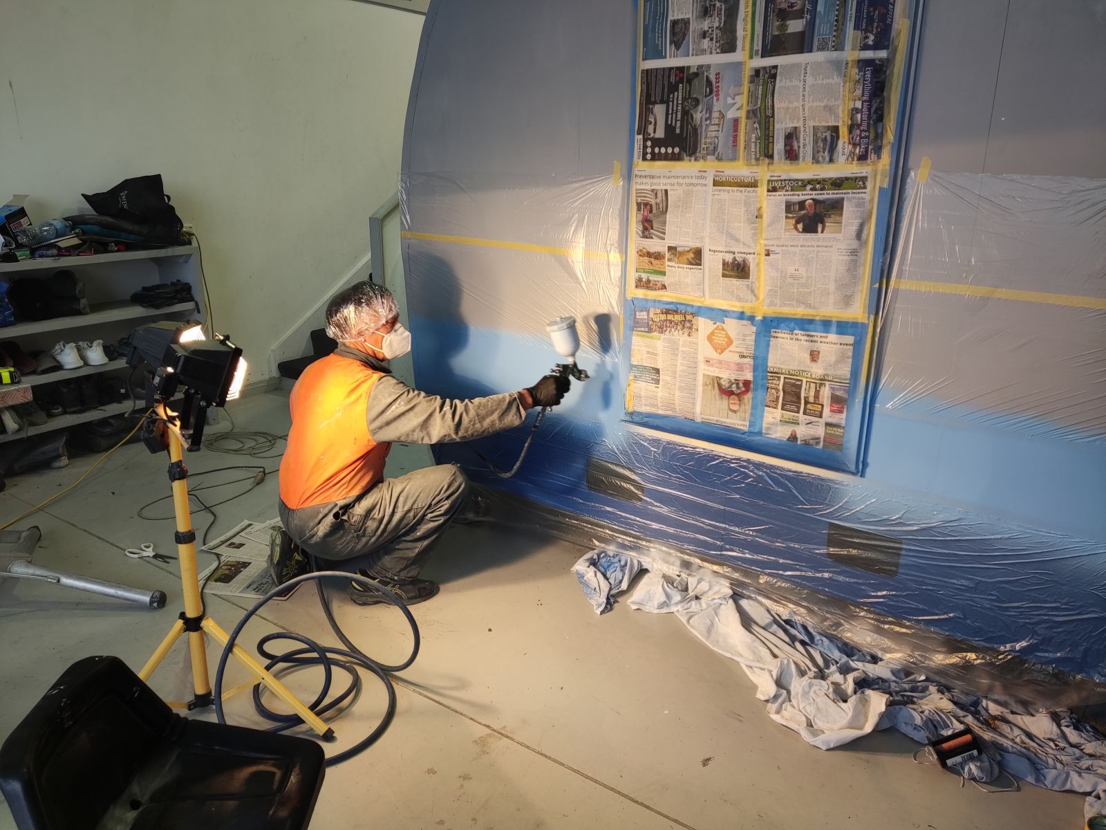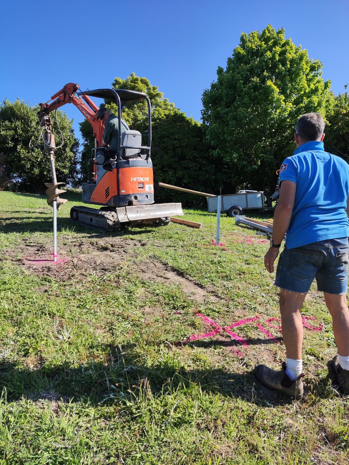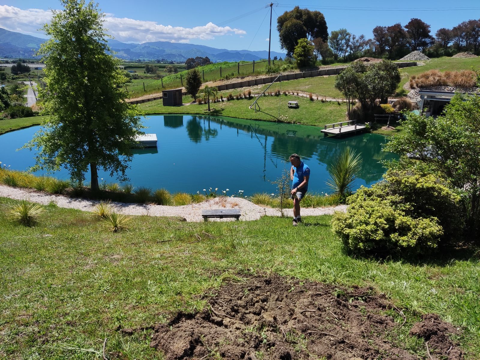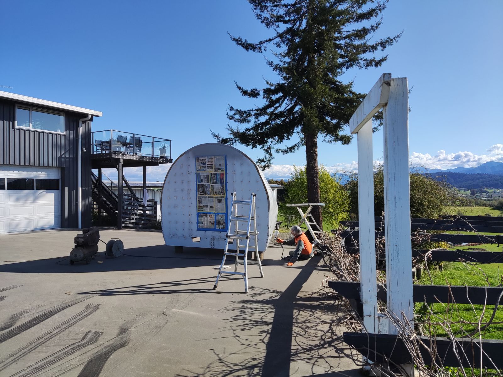 Unser Vermieter hat das Cockpit ohne Nase einer ausrangierten Boeing 737-300 irgendwo aufgetrieben. Der Transport allein auf dem Anhänger zu sich nach Hause muss wohl schon interessant gewesen sein, da ein Flugzeug auf der Strasse nichts alltägliches ist. Angefangen hat Ross dann mit dem Entfernen aller Leitungen. Dann musste der Rahmen hinten nachgebildet werden. Das erfolgte mit kurzen Metallstücken die er zusammengeschweisst hatte, damit es wieder stabilisierend den Bogen ergibt. Für die Nase wurden Styroporplatten zusammengeklebt und dann mit einem Gitter als Muster zu der Form abgeschliffen. Das muss wohl eine Riesensauerei gewesen sein. Ab diesem Zeitpunkt sind wir dann aus Deutschland angekommen. Die Nase wurde dann mit Glasfasermatten verstärkt, grundiert und an den vorderen Teil des Cockpits befestigt. Im nächsten Schritt wurden Muster für die Fenster aus Karton ausgeschnitten und das Plexiglas entsprechend zugeschnitten. Die Fenster wurden eingeklebt und mit Silikon abgedichtet. Mussten teilweise noch erwärmt werden, da sie nicht plan eingebaut werden konnten. Die seitlichen unteren Bleche wurden zugeschnitten und alles vernietet. Die Wand hinten wurde aus Holzplatten gemacht, aus 2 Teilen bei denen der Türausschnitt schon eingerechnet ist. Abdichtung hinten dann mit Abkantblechen und verklebt. Dann die Tür eingebaut. Um Frischluft reinzubekommen wurden kleine Gitter seitlich eingebaut. Dann noch weiche Schaumstoffmatten eingelegt, bevor dann der Teppich drüber gekommen ist. Nachdem dann das komplette Flugzeug abgeschliffen wurde kam die große Herausforderung es irgendwie aus der Garage zu befördern um es dann zu grundieren und lackieren. Mit verlängerten Gabeln und Ross‘ Traktor konnte das Cockpit angehoben werden und ganz langsam rückwärts aus der Garage gefahren werden. Nun konnte das Cockpit lackiert werden in den Originalfarben. Das ganze Cockpit wieder zurück in die Garage und auf die 3 provisorisch verschraubten Pfosten gesetzt. Cockpit war nun fertig und bereit für seinen ersten und letzten Flug zu seinem Zielflughafen: auf die Wiese am See mit direktem Blick darauf. Die Frage stellte sich wie wir es schaffen die 3 Metallpfosten genau an die Stelle unten an dem Hang einzubetonieren wo letztendlich sein sollte. Ross hatte ein Dreieck zusammengeschweißt aus Metallschienen und an jeder Ecke ein Loch gebohrt. Zur weiteren Vorbereitung wurden Metallplatten auf die Metallpfosten geschweißt mit jeweils 3 Bolzen auf der Mitte. Zinkspray gegen Rost um nun mit dem Muster genau die Stelle zu markieren für die Löcher am Boden wo das Cockpit genau sein sollte. An der Stelle war ein Busch. Den haben wir dann mit dem Traktor und einer Kette einfach rausgerissen aus dem Boden. Wir haben das Metallmuster auf der hinteren Seite aufgelegt und die vordere Seite soweit angehoben dass sie im Wasser lag. Die Spitze vorne nach unten gelotet und mit Markierungsspray den Lochmittelpunkt am Boden markiert. Abends kam dann noch Ross‘ Nachbar Mark mit seinem kleinen Bagger und dem Schneckenbohrer worauf wir die 3 Löcher in den Boden graben konnten. Die hinteren 2 Löcher waren nur ein Meter tief das vordere Loch ein 1,70m. Dann noch den Dreck weggeschaufelt und weiter ging es am nächsten Tag mit dem Positionieren und Befestigen der 3 Pfosten als Vorbereitung für das Einbetonieren. Wir hatten dazu Kieselsteine geholt um ein wenig die Pfosten wieder höher zu setzen und einen besseren Untergrund zu bekommen. Dann die 3 Pfosten eingesetzt mit Klammern an Holz Verstrebungen befestigt und entsprechend austariert und ins Wasser gesetzt. Dann ging es weiter die Löcher mit Beton zu füllen. Wir haben zirka 40 Schubkarren Beton mit einem kleinen Mischer benötigt um die 3 Löcher zu füllen. Am nächsten Tag, also 24 Stunden später, ging es dann los das Cockpit auf seine Reise zu schicken zu seinem finalen Standort Wir hatten uns den Abend zuvor sämtliche Gedanken gemacht wie dies am besten erfolgen könnte da das Gelände doch sehr abschüssig und steil ist und die langen Gabeln vom Traktor sich leicht nach links und rechts verschieben lassen. Wir haben dazu unter dem Cockpit, nachdem wir die Gabeln langsam eingefahren hatten, links und rechts von der Gabel lange Holzlatten angeschraubt wie eine Spur beim Ski Weitsprung. Dann ging es los rückwärts aus der Garage, um das Wohnhaus herum, mit 0,8 km/h ganz langsam den Hang hinunter. Per Headset konnten Ross und ich kommunizieren um entsprechend die Gabel nach oben oder in einen anderen Winkel zu bekommen als Ausgleich für den Hang. Wir kamen dem Ziel immer näher, unser Herz raste, und als wir final vor den Pfosten standen ging es nun darum die 3 Metallplatten der Pfosten genau zu treffen. Dies hat ein Weilchen gedauert, weil es mit dem Traktor nur vorwärts und rückwärts ging und man die Gabeln nicht links und rechts verschieben konnte. Zumal war das Gelände dort auch abschüssig wir haben es dann geschafft die 3 Pfosten zu treffen. Yeeees – geschafft! Mit einem Spanngurt konnten wir die vordere Auflagefläche des Cockpits noch besser mittig auf den Pfosten platzieren, final noch mit Schrauben und Muttern befestigt – fertig. Das Cockpit stand an seiner Stelle wir waren happy und haben unsere großen Tag mit einem tollen Barbecue und Bier beendet.