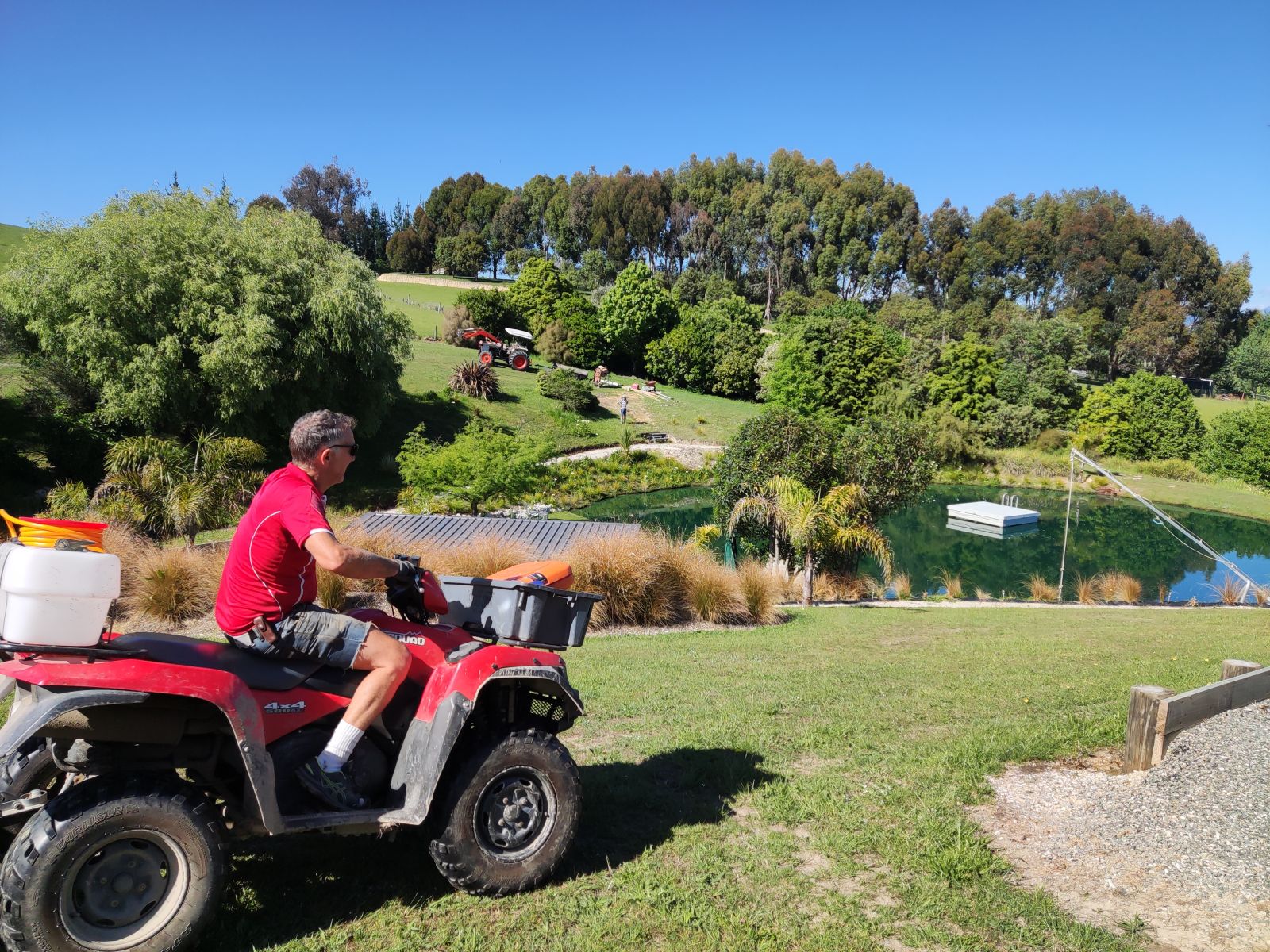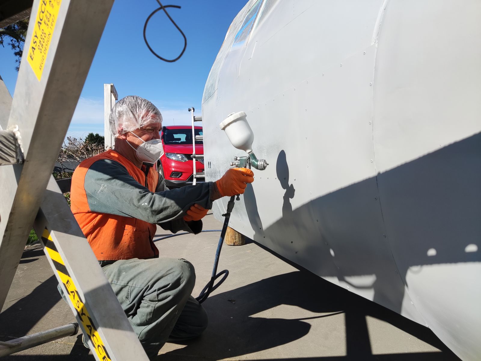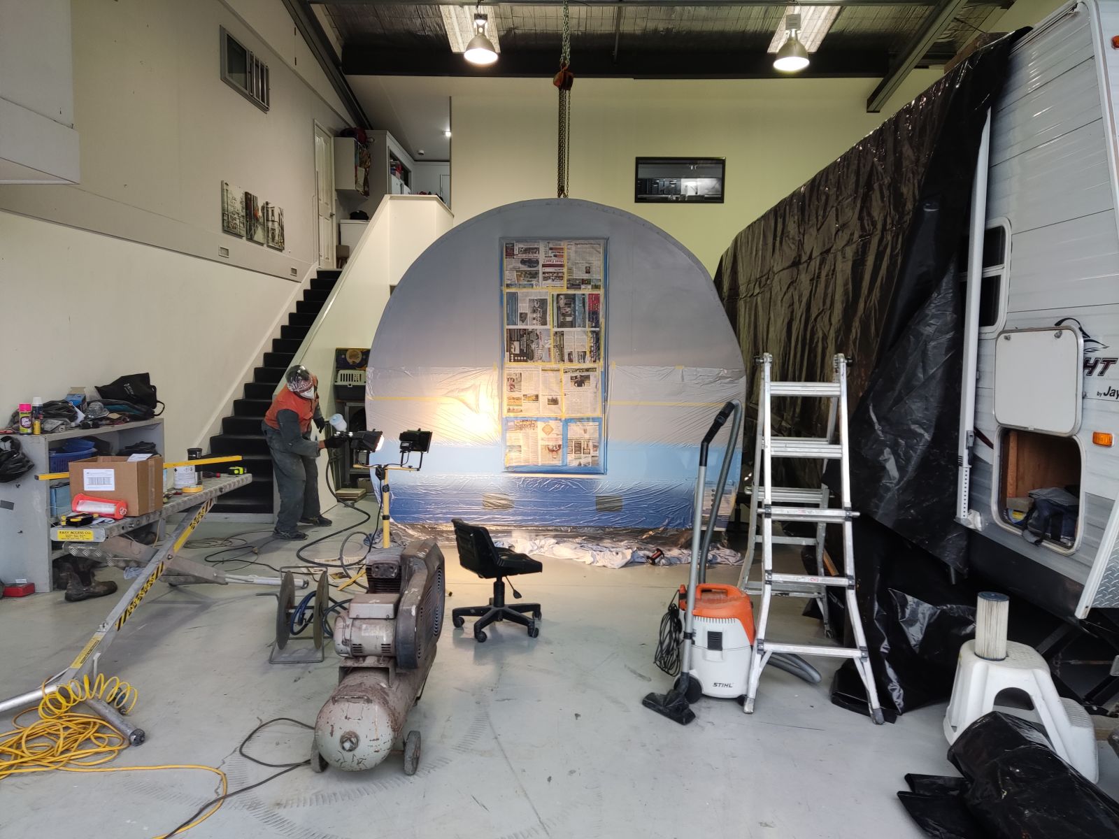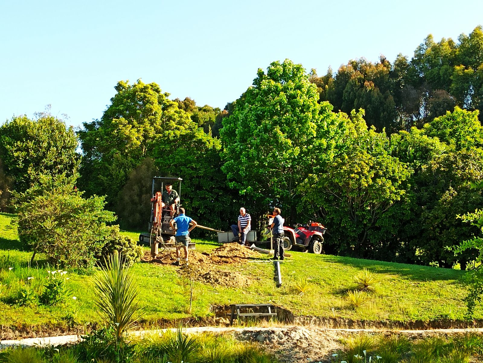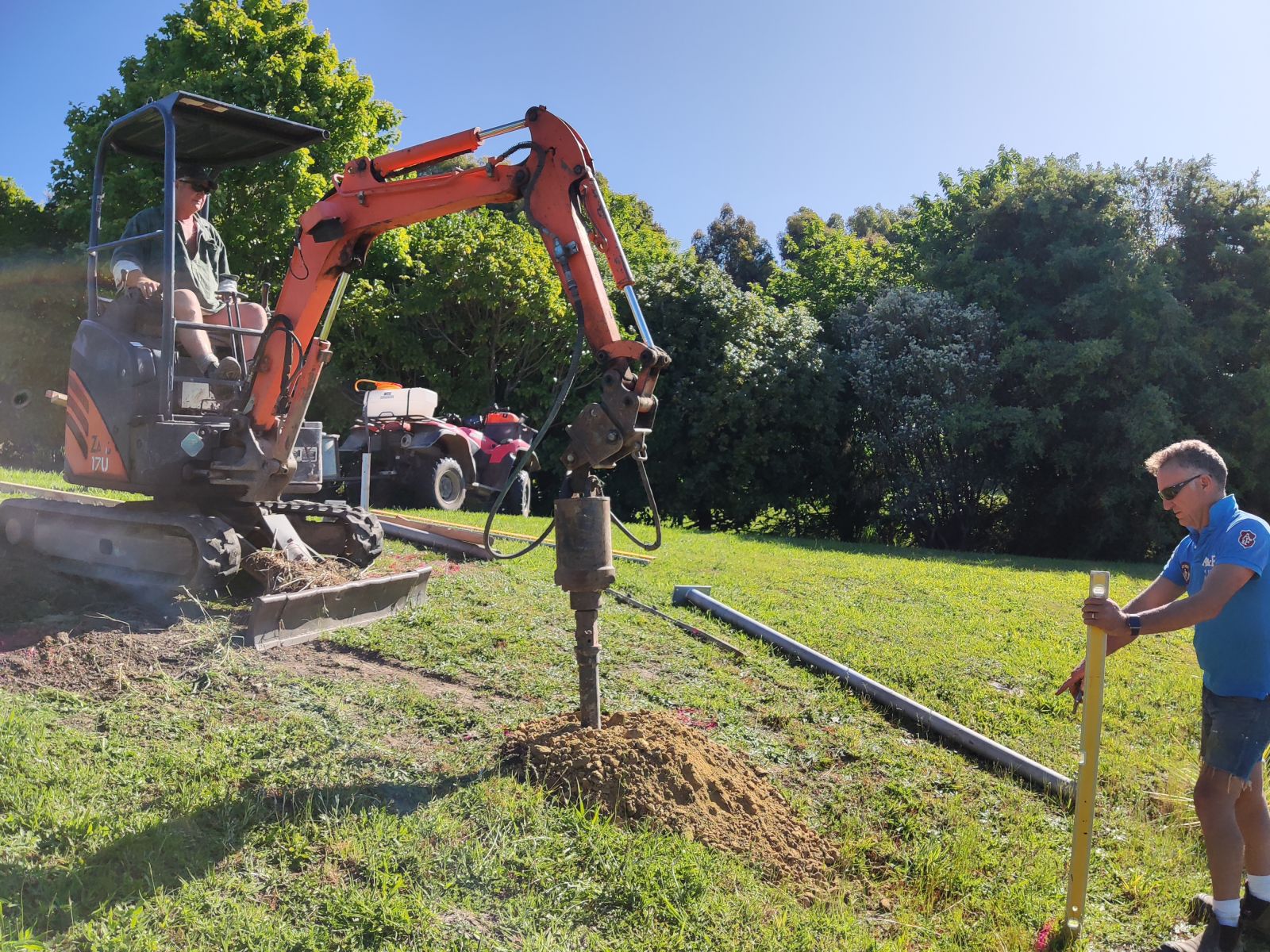 Unser Vermieter hat das Cockpit ohne Nase einer ausrangierten Boeing 737-300 irgendwo aufgetrieben. Der Transport allein auf dem Anhänger zu sich nach Hause muss wohl schon interessant gewesen sein, da ein Flugzeug auf der Strasse nichts alltägliches ist. Angefangen hat Ross dann mit dem Entfernen aller Leitungen. Dann musste der Rahmen hinten nachgebildet werden. Das erfolgte mit kurzen Metallstücken die er zusammengeschweisst hatte, damit es wieder stabilisierend den Bogen ergibt. Für die Nase wurden Styroporplatten zusammengeklebt und dann mit einem Gitter als Muster zu der Form abgeschliffen. Das muss wohl eine Riesensauerei gewesen sein. Ab diesem Zeitpunkt sind wir dann aus Deutschland angekommen. Die Nase wurde dann mit Glasfasermatten verstärkt, grundiert und an den vorderen Teil des Cockpits befestigt. Im nächsten Schritt wurden Muster für die Fenster aus Karton ausgeschnitten und das Plexiglas entsprechend zugeschnitten. Die Fenster wurden eingeklebt und mit Silikon abgedichtet. Mussten teilweise noch erwärmt werden, da sie nicht plan eingebaut werden konnten. Die seitlichen unteren Bleche wurden zugeschnitten und alles vernietet. Die Wand hinten wurde aus Holzplatten gemacht, aus 2 Teilen bei denen der Türausschnitt schon eingerechnet ist. Abdichtung hinten dann mit Abkantblechen und verklebt. Dann die Tür eingebaut. Um Frischluft reinzubekommen wurden kleine Gitter seitlich eingebaut. Dann noch weiche Schaumstoffmatten eingelegt, bevor dann der Teppich drüber gekommen ist. Nachdem dann das komplette Flugzeug abgeschliffen wurde kam die große Herausforderung es irgendwie aus der Garage zu befördern um es dann zu grundieren und lackieren. Mit verlängerten Gabeln und Ross‘ Traktor konnte das Cockpit angehoben werden und ganz langsam rückwärts aus der Garage gefahren werden. Nun konnte das Cockpit lackiert werden in den Originalfarben. Das ganze Cockpit wieder zurück in die Garage und auf die 3 provisorisch verschraubten Pfosten gesetzt. Cockpit war nun fertig und bereit für seinen ersten und letzten Flug zu seinem Zielflughafen: auf die Wiese am See mit direktem Blick darauf. Die Frage stellte sich wie wir es schaffen die 3 Metallpfosten genau an die Stelle unten an dem Hang einzubetonieren wo letztendlich sein sollte. Ross hatte ein Dreieck zusammengeschweißt aus Metallschienen und an jeder Ecke ein Loch gebohrt. Zur weiteren Vorbereitung wurden Metallplatten auf die Metallpfosten geschweißt mit jeweils 3 Bolzen auf der Mitte. Zinkspray gegen Rost um nun mit dem Muster genau die Stelle zu markieren für die Löcher am Boden wo das Cockpit genau sein sollte. An der Stelle war ein Busch. Den haben wir dann mit dem Traktor und einer Kette einfach rausgerissen aus dem Boden. Wir haben das Metallmuster auf der hinteren Seite aufgelegt und die vordere Seite soweit angehoben dass sie im Wasser lag. Die Spitze vorne nach unten gelotet und mit Markierungsspray den Lochmittelpunkt am Boden markiert. Abends kam dann noch Ross‘ Nachbar Mark mit seinem kleinen Bagger und dem Schneckenbohrer worauf wir die 3 Löcher in den Boden graben konnten. Die hinteren 2 Löcher waren nur ein Meter tief das vordere Loch ein 1,70m. Dann noch den Dreck weggeschaufelt und weiter ging es am nächsten Tag mit dem Positionieren und Befestigen der 3 Pfosten als Vorbereitung für das Einbetonieren. Wir hatten dazu Kieselsteine geholt um ein wenig die Pfosten wieder höher zu setzen und einen besseren Untergrund zu bekommen. Dann die 3 Pfosten eingesetzt mit Klammern an Holz Verstrebungen befestigt und entsprechend austariert und ins Wasser gesetzt. Dann ging es weiter die Löcher mit Beton zu füllen. Wir haben zirka 40 Schubkarren Beton mit einem kleinen Mischer benötigt um die 3 Löcher zu füllen. Am nächsten Tag, also 24 Stunden später, ging es dann los das Cockpit auf seine Reise zu schicken zu seinem finalen Standort Wir hatten uns den Abend zuvor sämtliche Gedanken gemacht wie dies am besten erfolgen könnte da das Gelände doch sehr abschüssig und steil ist und die langen Gabeln vom Traktor sich leicht nach links und rechts verschieben lassen. Wir haben dazu unter dem Cockpit, nachdem wir die Gabeln langsam eingefahren hatten, links und rechts von der Gabel lange Holzlatten angeschraubt wie eine Spur beim Ski Weitsprung. Dann ging es los rückwärts aus der Garage, um das Wohnhaus herum, mit 0,8 km/h ganz langsam den Hang hinunter. Per Headset konnten Ross und ich kommunizieren um entsprechend die Gabel nach oben oder in einen anderen Winkel zu bekommen als Ausgleich für den Hang. Wir kamen dem Ziel immer näher, unser Herz raste, und als wir final vor den Pfosten standen ging es nun darum die 3 Metallplatten der Pfosten genau zu treffen. Dies hat ein Weilchen gedauert, weil es mit dem Traktor nur vorwärts und rückwärts ging und man die Gabeln nicht links und rechts verschieben konnte. Zumal war das Gelände dort auch abschüssig wir haben es dann geschafft die 3 Pfosten zu treffen. Yeeees – geschafft! Mit einem Spanngurt konnten wir die vordere Auflagefläche des Cockpits noch besser mittig auf den Pfosten platzieren, final noch mit Schrauben und Muttern befestigt – fertig. Das Cockpit stand an seiner Stelle wir waren happy und haben unsere großen Tag mit einem tollen Barbecue und Bier beendet.