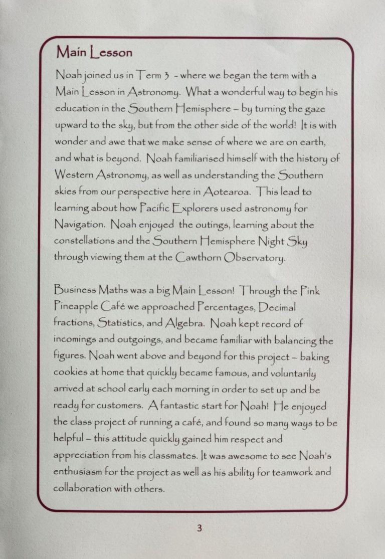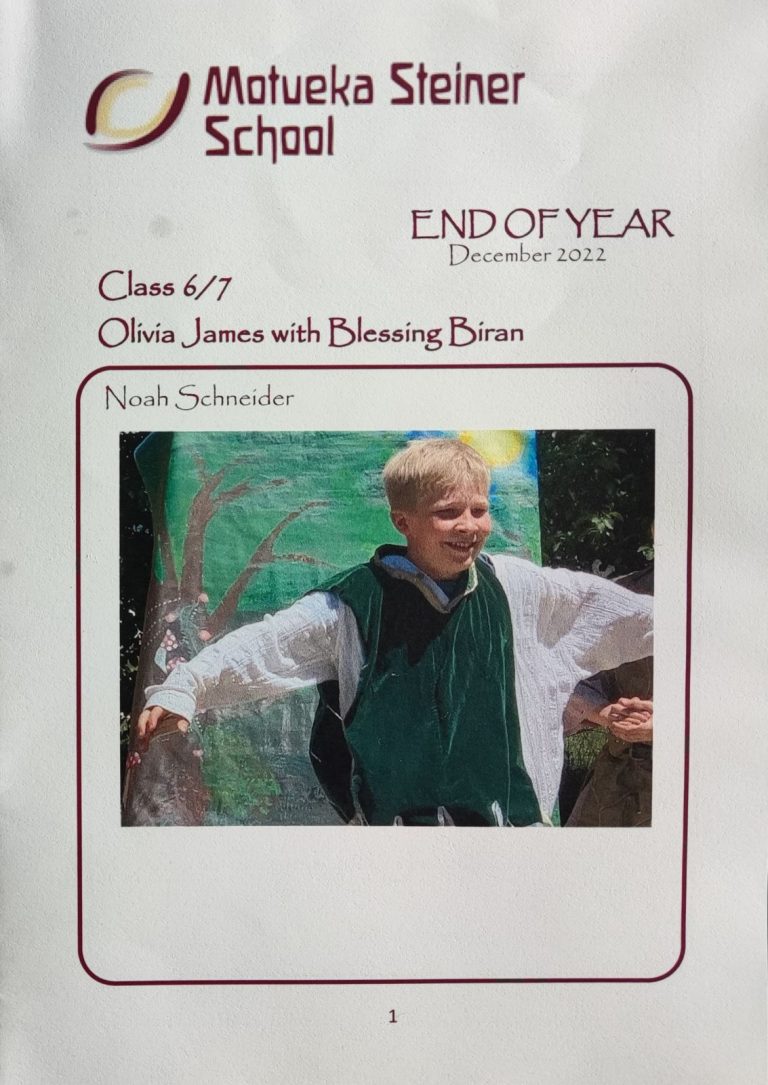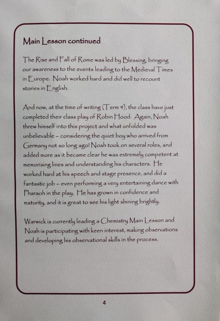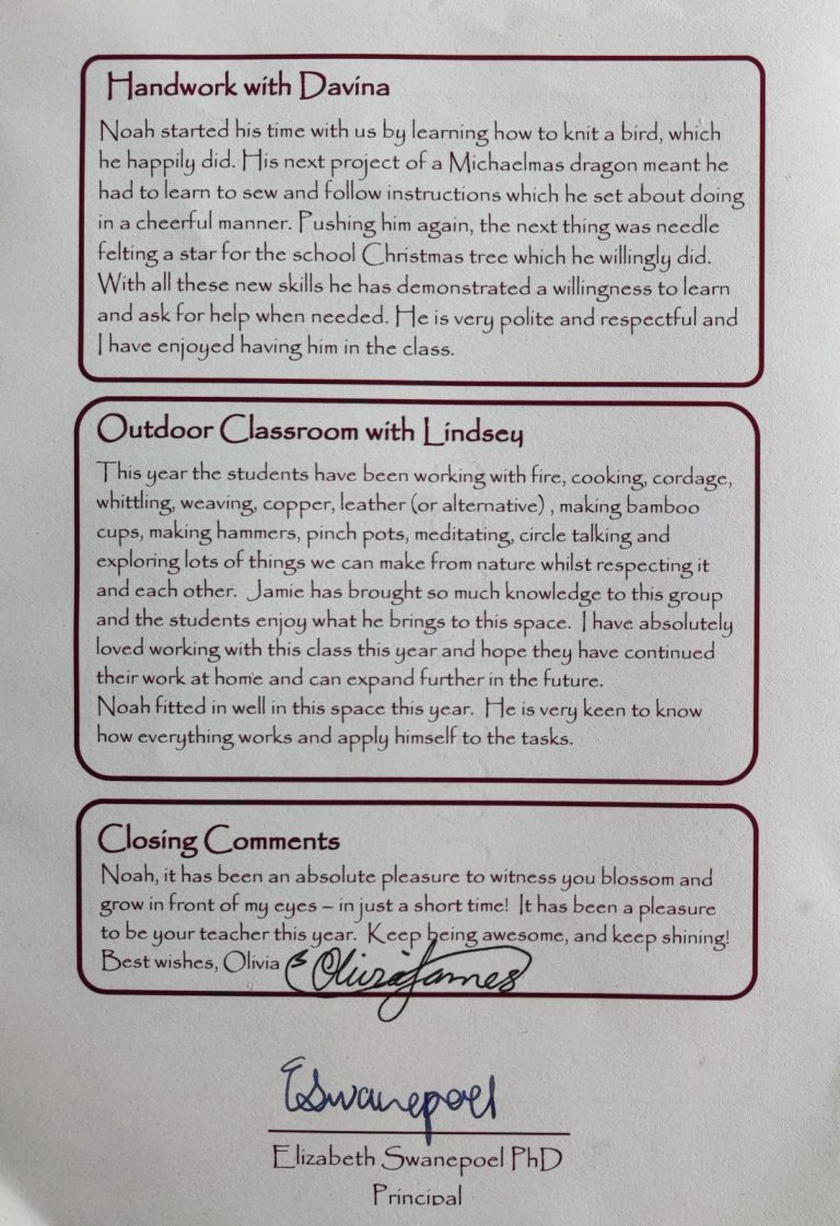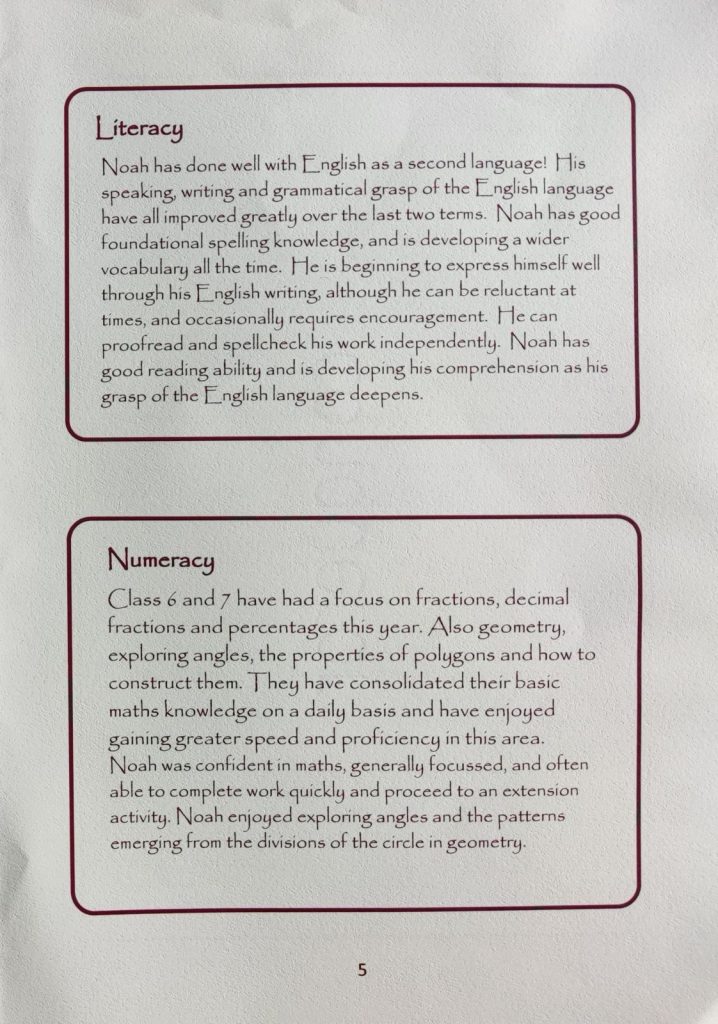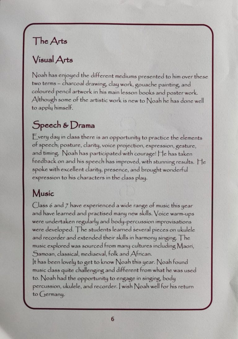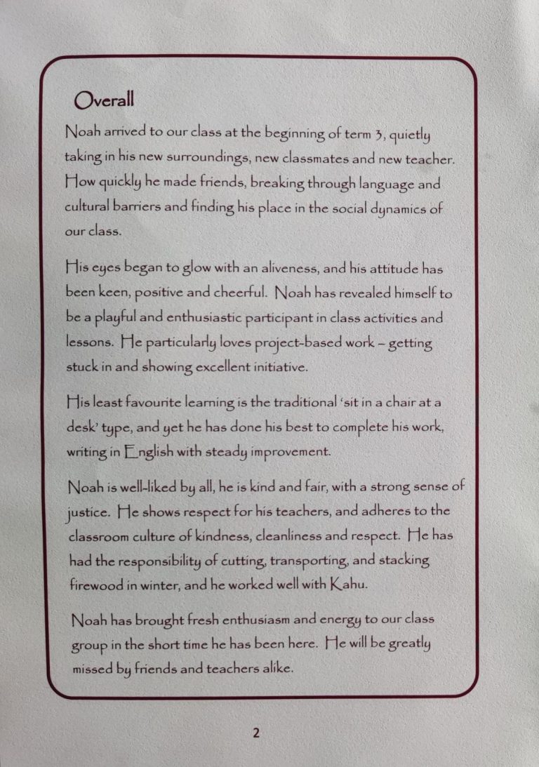 Die 2 Terms sind nun vorbei. Noah hatte seine Schulverabschiedung und seinen Schulreport bekommen. Den Text haben wir jeweils unter dem Bild übersetzt.