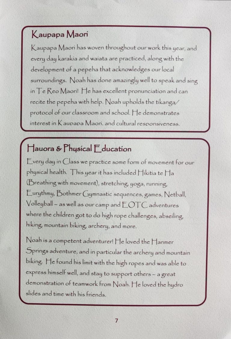 Kaupapa Maori hat uns durchweg dieses Jahr beschäftigt, jeden Tag wurden Karakia und Waiata praktiziert, zusammen mit der Entwicklung eines Pepeha, welches im lokalen Umfeld bekannt ist. Noah hat es erstaunlich gut gemacht, zu sprechen und zu singen in Te Reo Maori! Er hat eine ausgezeichnete Aussprache und kann die Pepeha mit Hilfe rezitieren. Noah hält das Tikanga- Protokoll unseres Klassenzimmers und unserer Schule aufrecht. Er demonstriert Interesse an Kaupapa Maori und kulturellen Bedürfnissen.