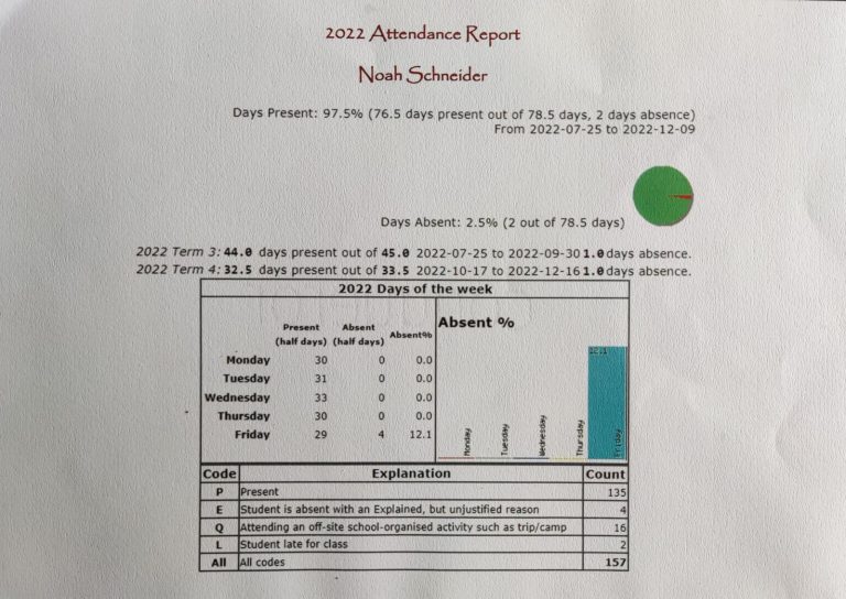 Und jetzt noch Noah’s Anwesenheitsübersicht:
